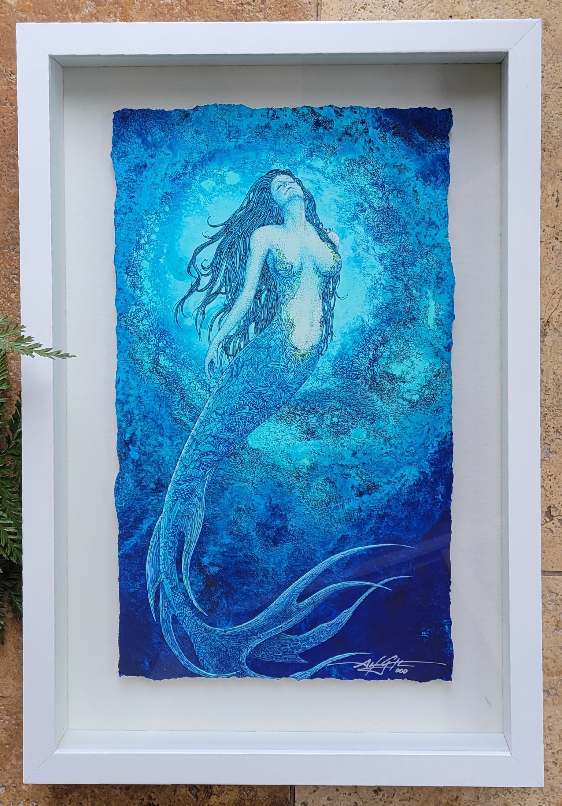 Paper Giclee with hand torn edges floated on a white background in a white frame.
