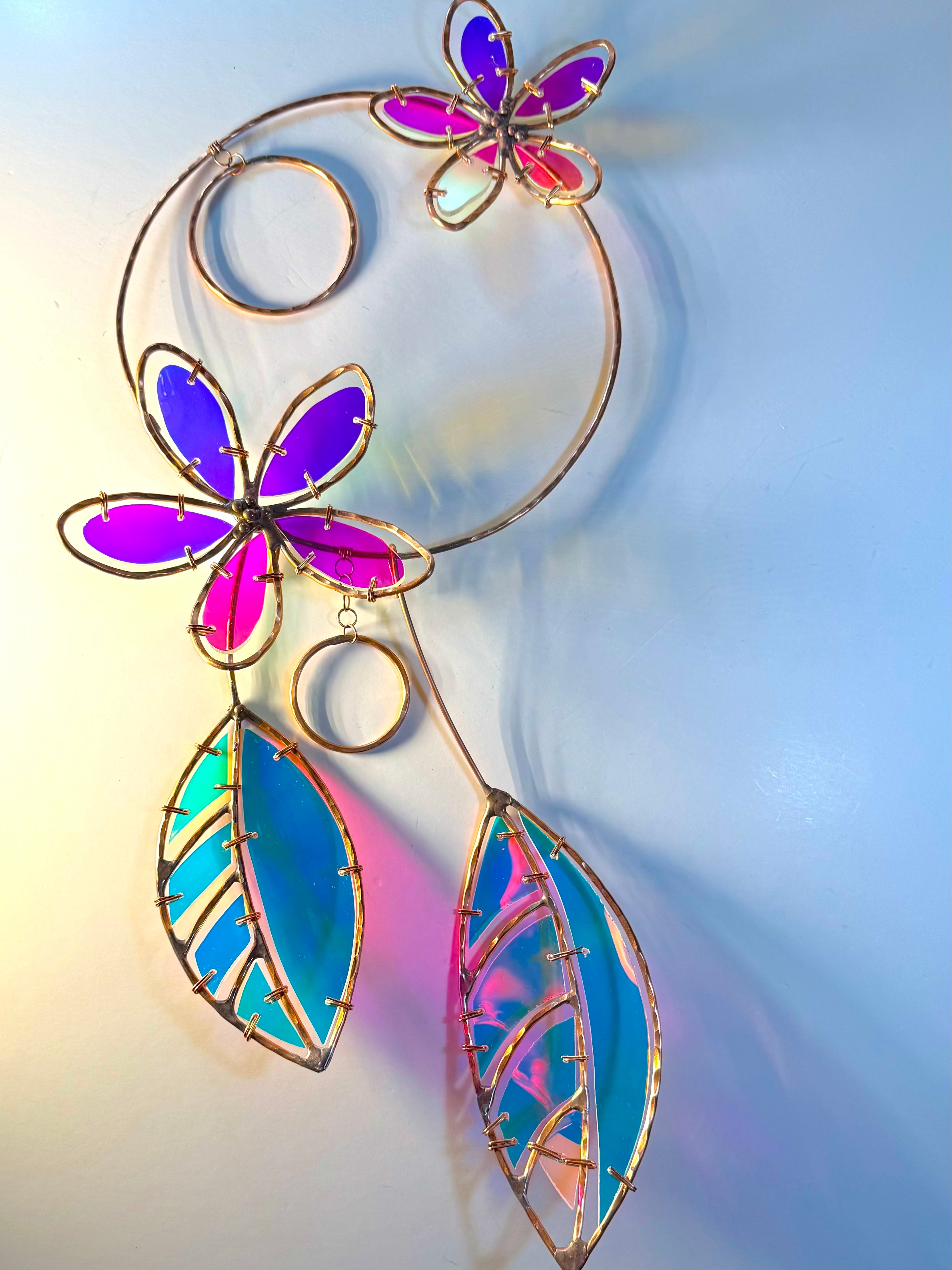 Dichroic Glass Sculpture with hand forged copper | 22" x 8" | OriginalThe artist creates her original sculptures using dichroic film applied to acrylic, hand-forged